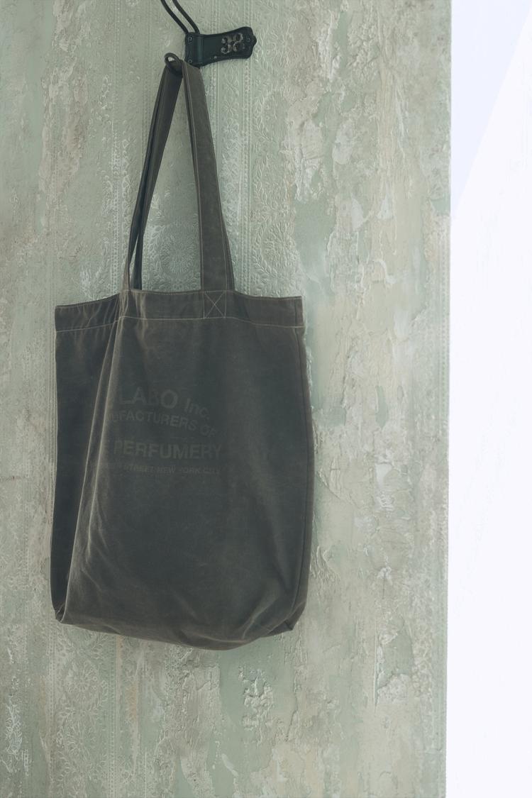 そしてもう一つ、ワックス キャンバス トート バッグにも興味を示した。ワックス加工されたキャンバス地の天然素材で、一つ一つが唯一無二。使い込むほどに素材のテクスチャーや印刷部分が変化し、より美しく、ユニークなものへと育っていく。