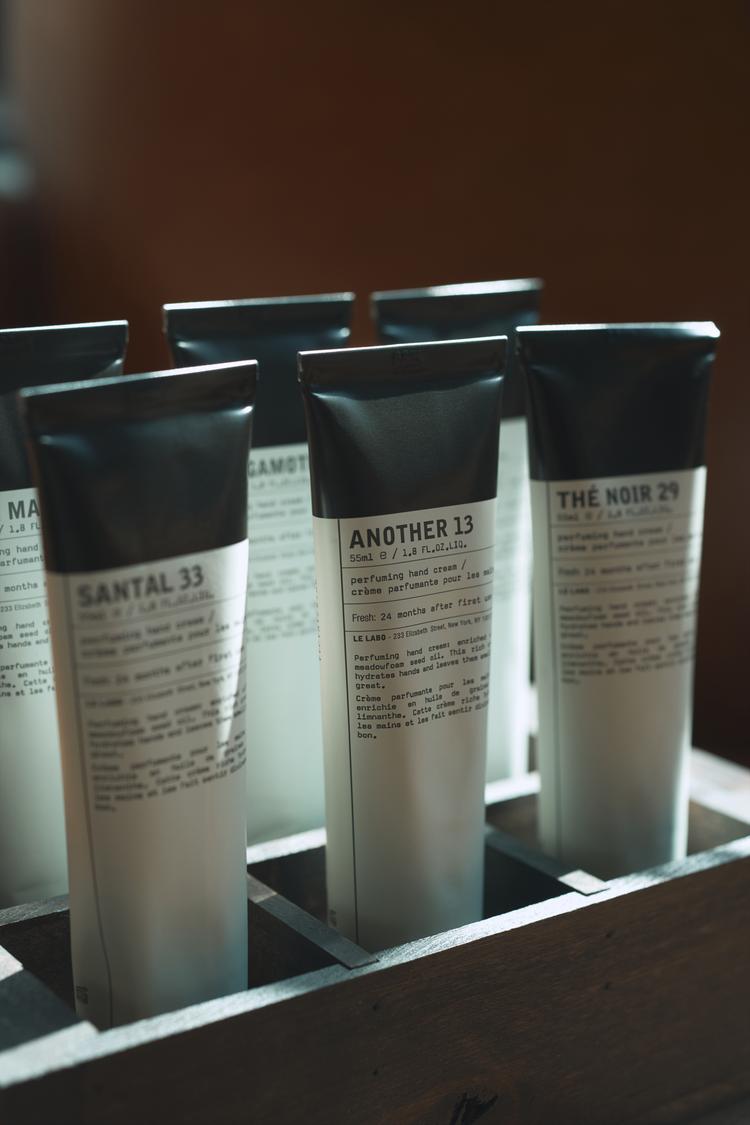 そう語りながらも、店内を巡る松重さんの表情は興味深げだ。ル ラボのフレグランスは、均一なボトルにラベル、アルファベットに続き番号が振られている。「SANTAL 33」「ROSE 31」「ANOTHER 13」——番号は主原材料名とその香りを作るうえで必要だった香料の数。