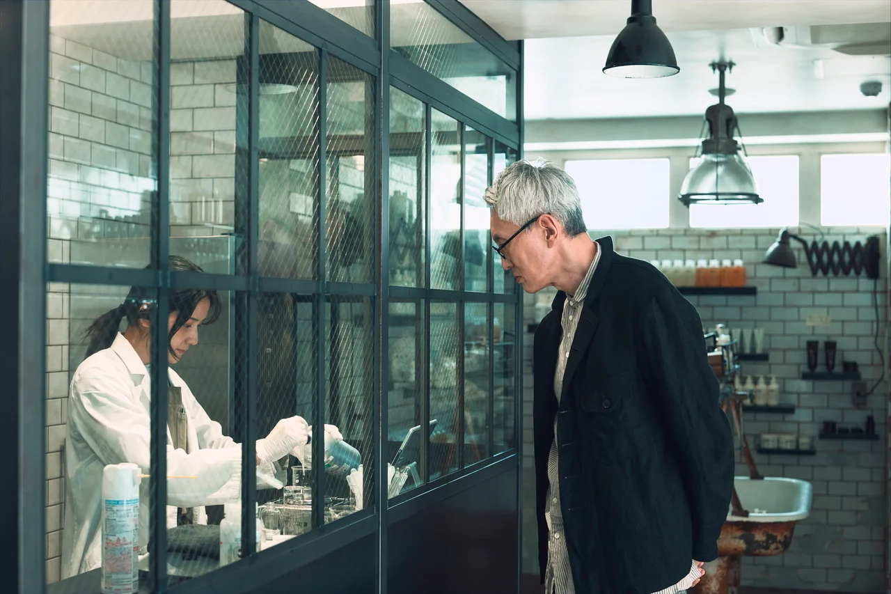 普段から二子玉川エリアに通う松重さんにとって、雑居ビルが立ち並ぶこの一画に路面店として佇むル ラボは新鮮な驚きだった。店内に入ると、ずらりと並ぶフレグランスのボトル、そしてその場で調合される「フレッシュブレンディング」の光景が目に飛び込んでくる。