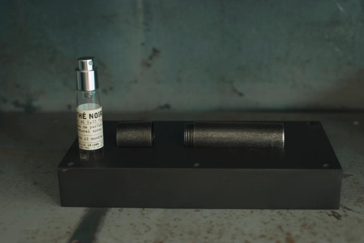 手に取ったのは、トラベル チューブ ケース。リフィルボトルを入れて使うことができ、バッグやポケットに入れて、どこへでも自分の香りを持ち運べるオリジナルのヴィンテージメタルケースだ。こちらもボックスへのパーソナライゼーションに対応している。