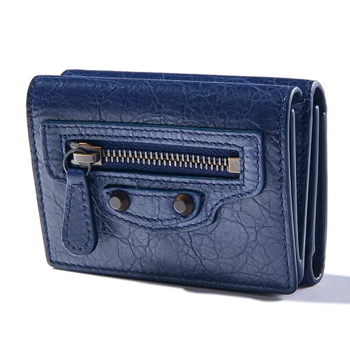 表面はアリーナラムスキン、内側はスムースレザー。バレンシアガの定番二つ折り財布のフォーマットを踏襲しつつ、キャッチーなデザインで鮮度をプラス。縦9.5×横11.5×マチ2cm コイン入れ1箇所、札入れ2箇所、カードスロット4箇所、フリーポケット2箇所。