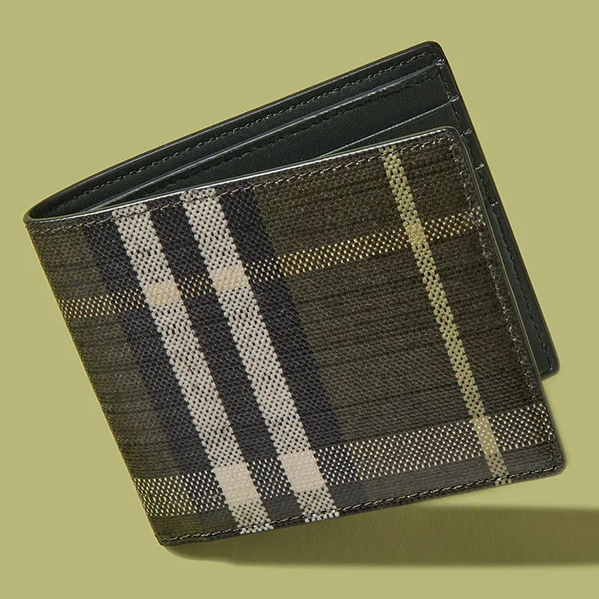 イタリア製のグレイニーカーフレザーを使用した二つ折りコインウォレット。一見シンプルな黒革の財布だが、内装はサンドカラーのバーバリーチェックで華やぎを添えた。フロントには1980年代のバーバリーバッグにあしらわれていたアーカイブモチーフ「ナイトスタンプ」のエナメルプレートのワンポイントも。