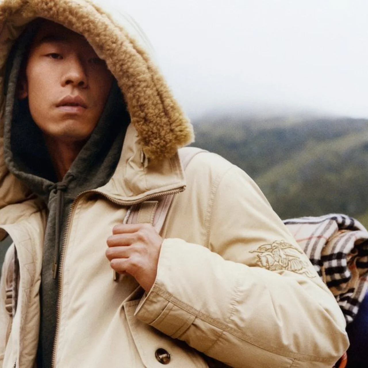 ナイロンブレンド糸を高密度に織り上げたバーバリーチェックのファブリックを使用。テクニカルでスポーティなルックスの「チェスター スリングバッグ」は、ラムスキンのトリムや「馬上の騎士」デザインを型押ししたレザーのラベルがラグジュアリーなムードを引き立てる。