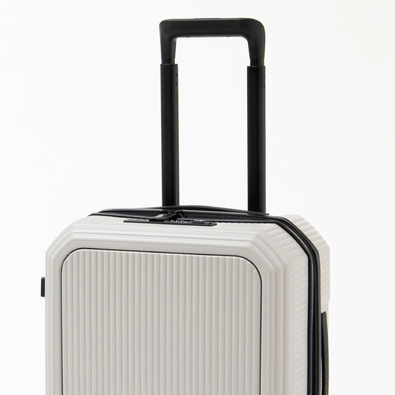 本作の注目すべきは、立てたまま開閉できるフロントポケット構造。移動中に本体を寝かせる必要があった従来のスーツケースとは異なり、PCや小物をスムーズに出し入れできる設計となっている。ポケット内部のファスナーを介してメイン収納部へアクセスできる点も、実用面での完成度を高めている。