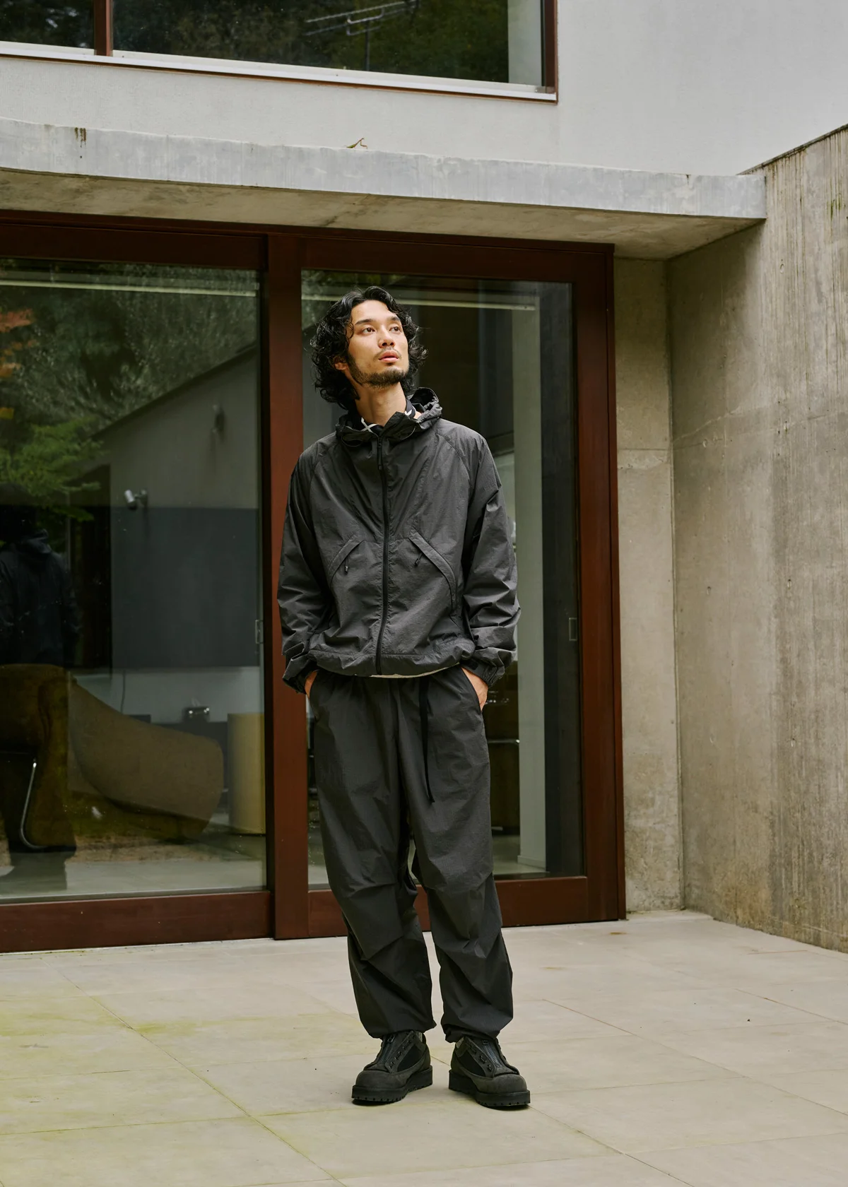 ゴールドウインのオリジナル生地を使ったセットアップで着られるジャケットとパンツを、アークネッツらしくアレンジ。生地は、原料の段階で色をつけてから糸にする「ドープダイ」と呼ばれる染色法を用いて、深みのあるカーボングレーカラーに染色しリップストップ生地に仕上げることで、さりげない陰影や色の深みが出て、独特の表情を生んでいる。撥水加工も施されているため、多少の雨も気にならない。ゆとりあるシルエットでリラックスした着心地のジャケットとパンツは、天候に左右されたくない週末着にうってつけ。
