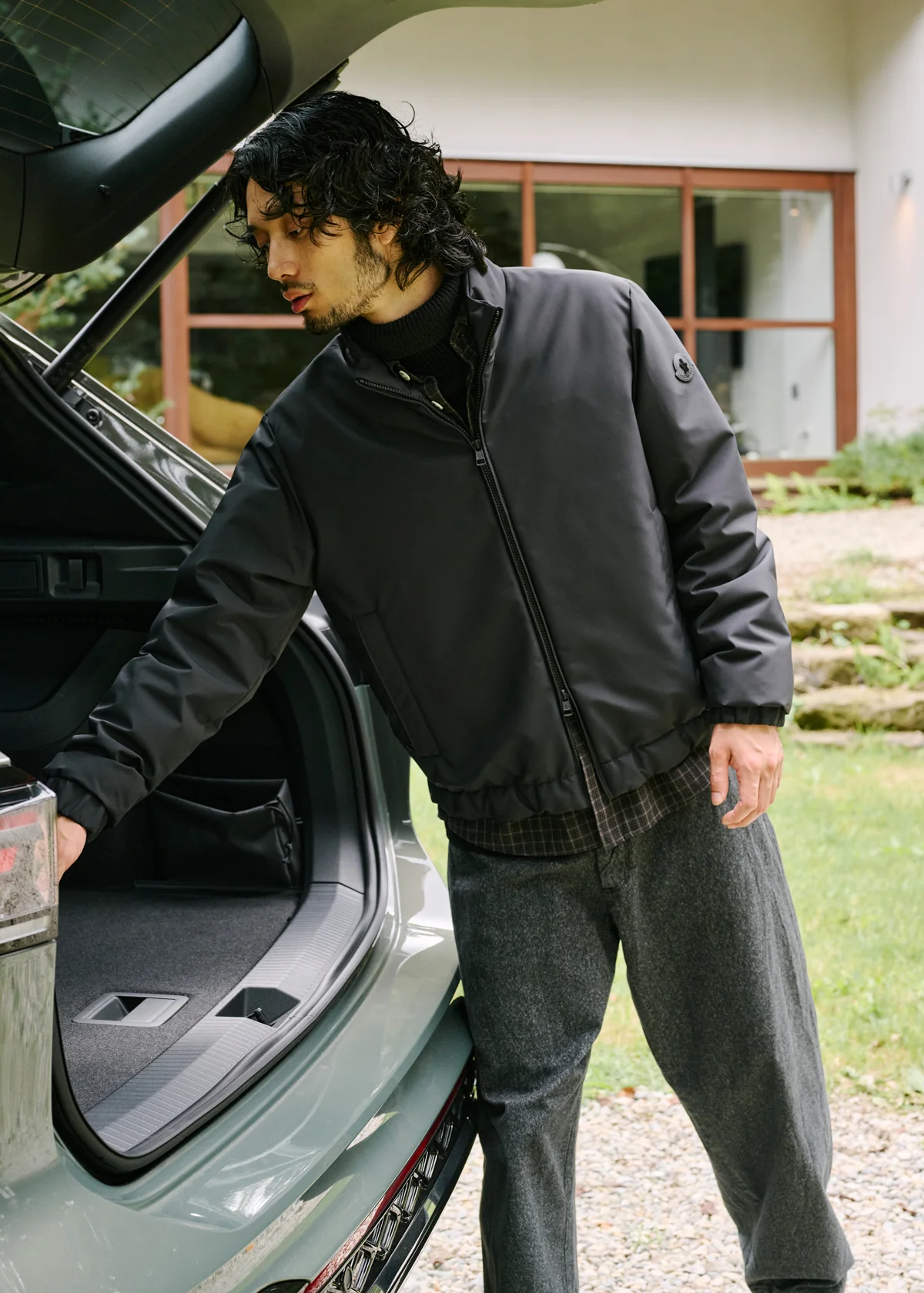 ダウンジャケットには、色味やブランドロゴが目立つアイテムも多いが、モダンに着こなしたいならアノニマスなものを選びたい。こちらのモンクレールは、スタンドカラーでトラックタイプの定番「ルセルナジャケット」を、潔くブラック一色に。おなじみのロゴパッチはもちろん、ジップまで色を揃え、よりシックに生まれ変わった。ダウンは、厳しい品質基準をクリアしたホワイトグース。真冬でもシャツの上からはおるだけで十分なあたたかさがあり、別荘地など郊外の冷え込む朝晩でも頼りになる。それでいながら、決して肉厚すぎないため、クルマの運転などでもスマートに着られるのが嬉しい。