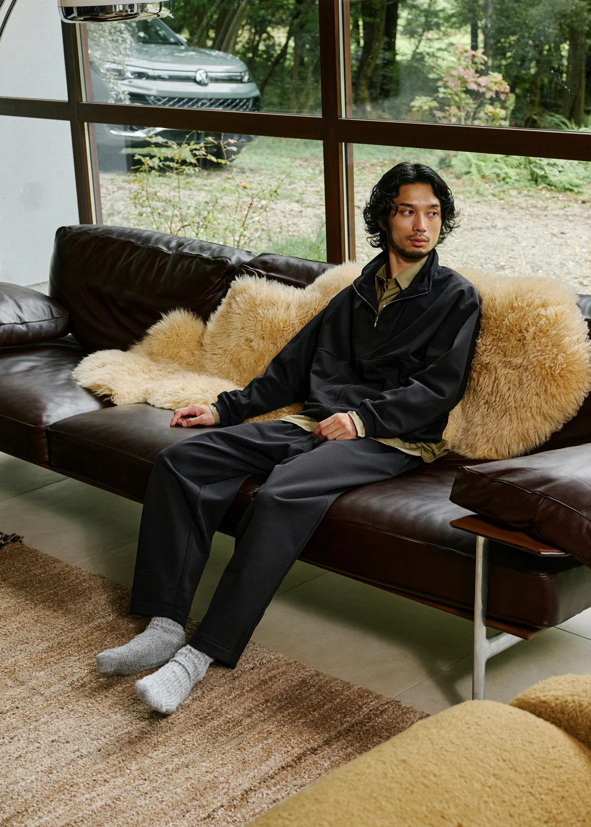 同じチャコールグレーのセットアップでも、こちらは日本の老舗ニットメーカーによるバトナーとの共作。ちょっと懐かしさのあるトラックジャケットのモデルを元に着丈を短くし、ドルマンスリーブのワイドなシルエットと好対照を描き出す。パンツは従来のシルエットより裾に向かって細くなるテーパードをぐっと効かせ、ドレスパンツのような趣に。カジュアルになりがちなジャージー素材のセットアップも、切り替え部分のステッチを隠し、光沢のあるエクセラジップを使うなど、大人の上品さを添えるディテールも抜かりない。ストレッチ性のある生地かつイージー仕様のパンツと相まって、週末にゆったりと過ごしたくなるセットアップだ。