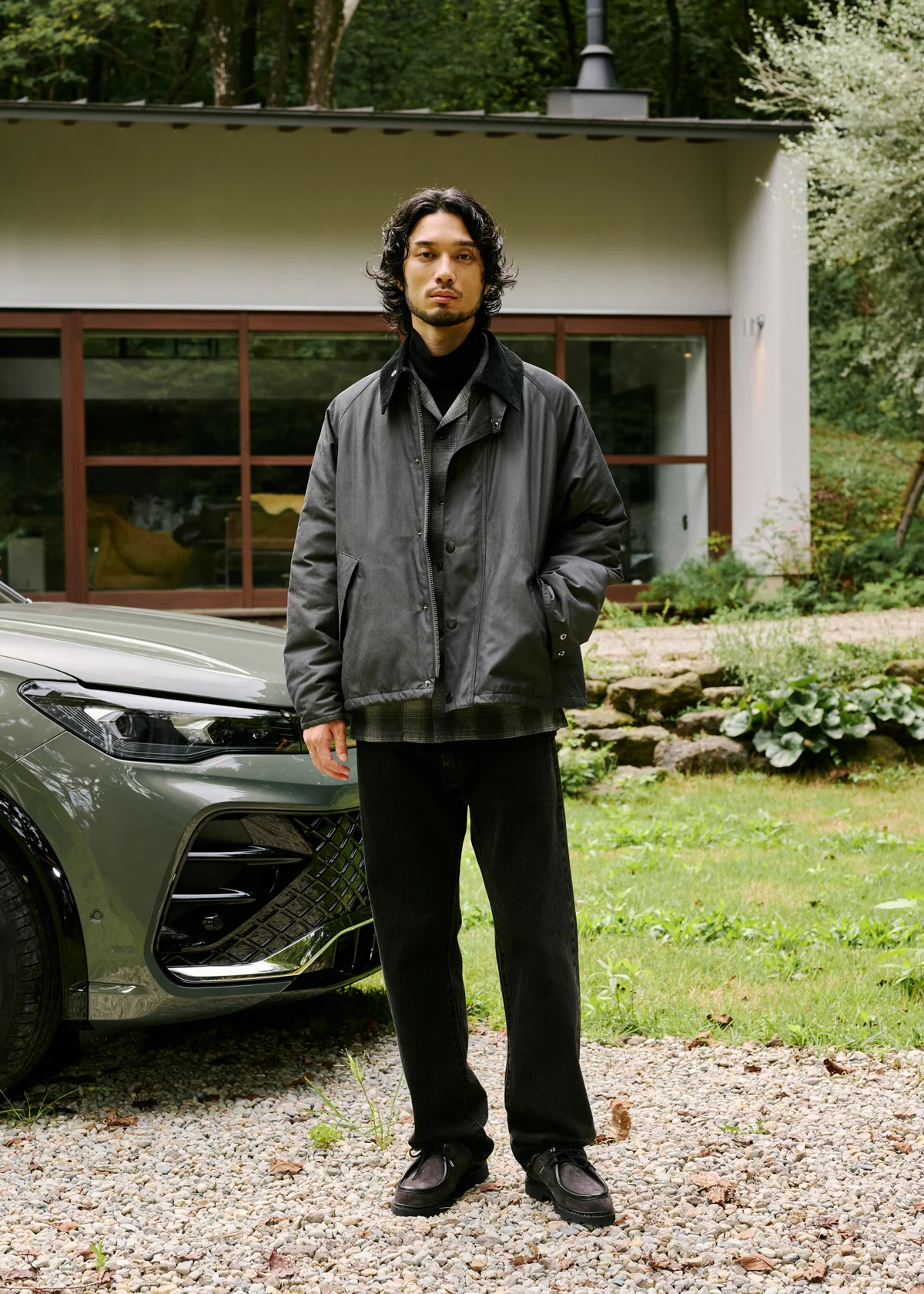 暗く重たくなりがちな冬の装いも、トーンや素材が異なるグレーを交えると奥行きを感じられる。バブアーに別注したジャケットは、マウンテンバイクに乗る人々からインスピレーションを得て誕生した「トランスポート」を元に、色だけでなく素材やシルエットもアレンジ。マットな風合いのピーチウェザーに、裏は中綿のキルティングを使って軽快かつ暖かい着心地に。シルエットも身幅をやや細く絞ってすっきりとさせた。