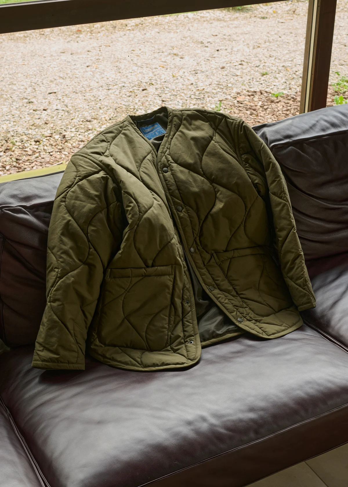 アウターで知られる英国ブランドといえば、キルティングを得意とするラベンハムも外せない。ミリタリーに由来するデザインをラベンハムらしい流線型のキルティング使いで見せた「キルティングライナージャケット」をベースに、軽快で抜け感のあるノーカラーの仕様やボクシーなウエストラインなどは継承。着こなしの印象を左右する袖先を、リブ仕様から筒袖に別注し、一段と上品に仕上げた。サフォーク州の自社工場で作られる確かな品質は、見て触れて、袖を通して分かるだろう。メインアウターとしてはもちろん、真冬にはコートと合わせてインナーとしての活躍も見込める。