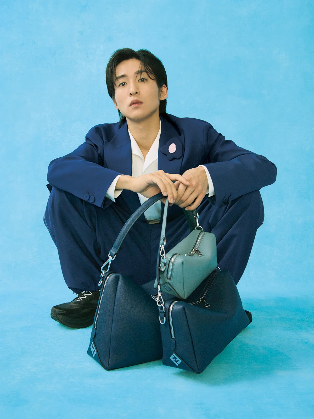 鮮やかなブルーのスーツに映える「サニーサイドフラワー」のブローチと、サイズ違いのバッグ「フェンディ ルイ」。同系色のカラーパレットは、大人の遊び心とベストマッチ。