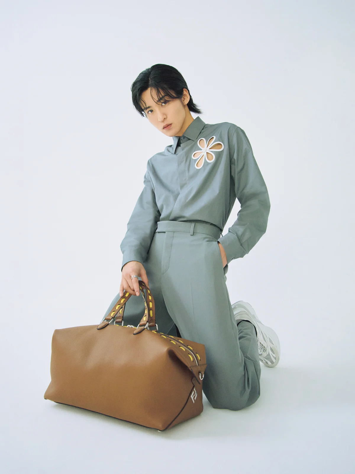 シャツの胸元に配されたデイジーのパイピングは、高揚感あふれる今の季節にぴったり。持ち手と開口部に「セレリア」ステッチが施された「フェンディ ルイ ダッフル」はまさにブランドの象徴的なバッグだ。新しいシーズンへともに一歩を踏み出したくなる。