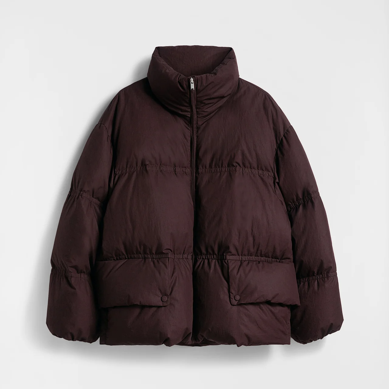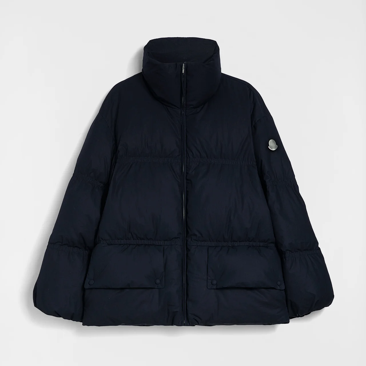 ボックスシルエットに丸みを与え、襟をふんわりと立ち上げたダウンジャケット「COLLINEMYCIN」が洗練された佇まい。華奢なジップと、袖のシルバーのモチーフがささやかな輝きを放つ。