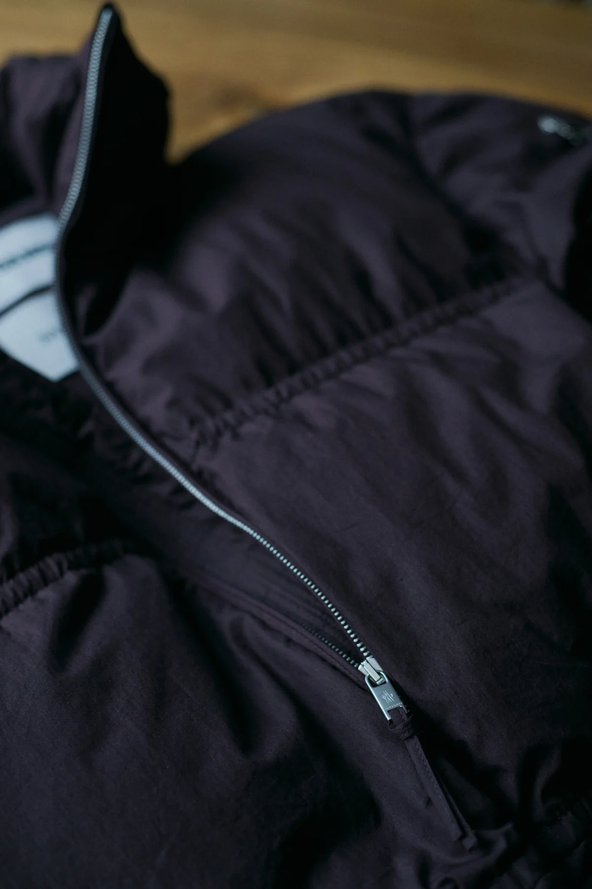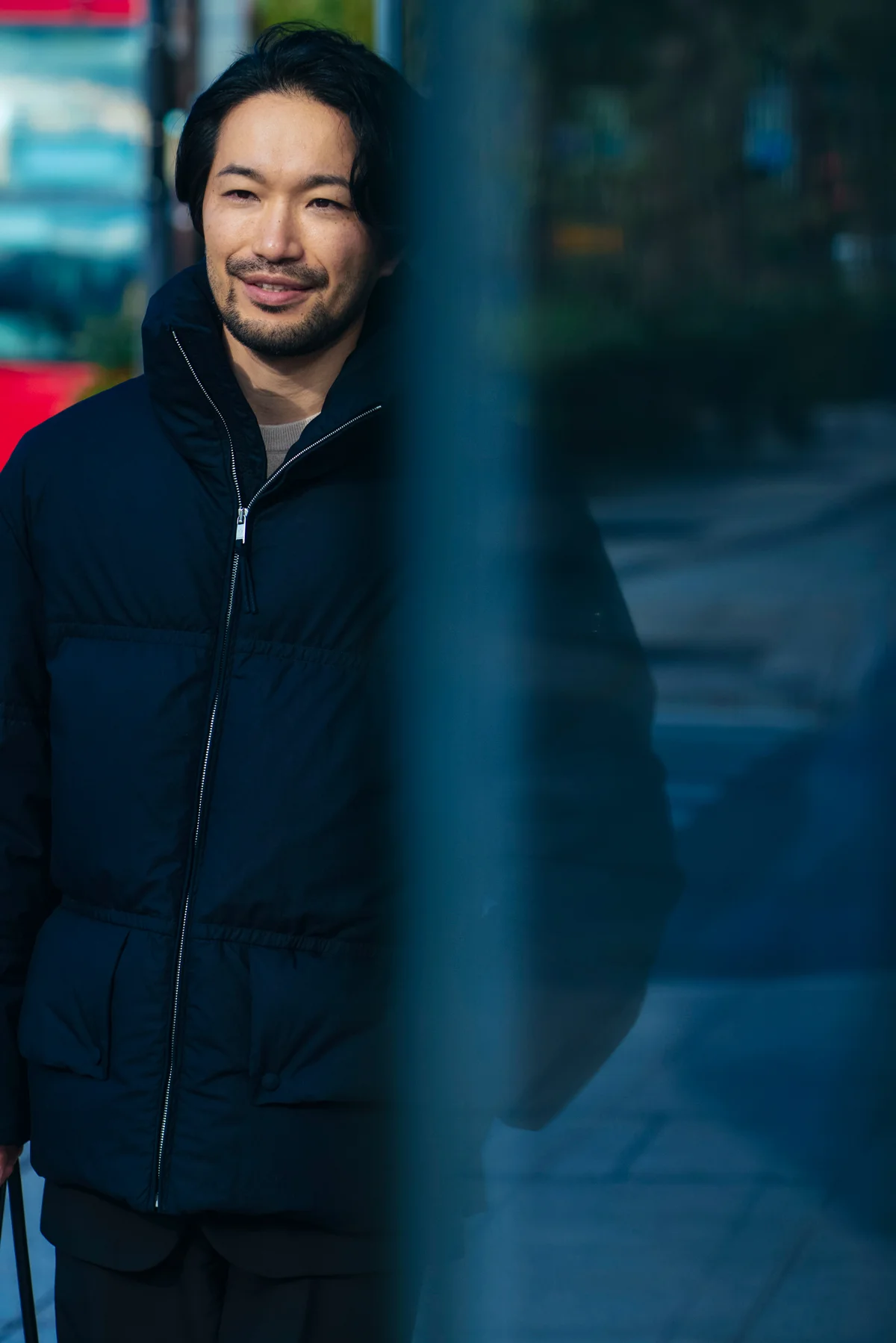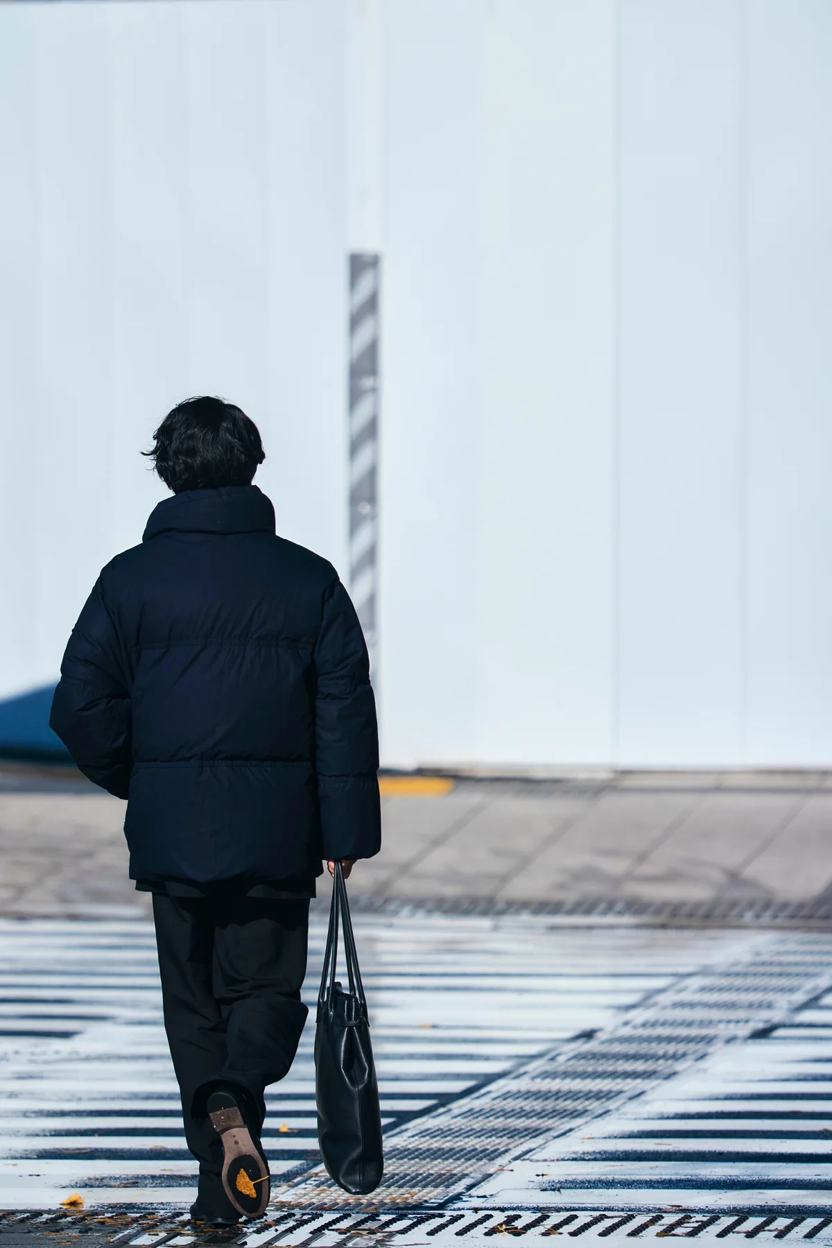 「冬は長野のもうひとつの家に行く機会が増えそうで、寒さを越える準備をしました。とはいえ、こたつで休みに行くわけではありません。氷点下の雪景色のなかで、自然の音を聴きながら仕事をすると、どんな感覚が広がるのかを楽しみに思っています。東京と地方は表と裏ではなく、あくまで右と左という幅のふくよかさがある。雪山だからと言ってケーブルニットを着てアウトドアブーツを履こうとは思っていません。このダウンジャケットのように、どこにいても同じ心持ちでいられる服が好きです。」