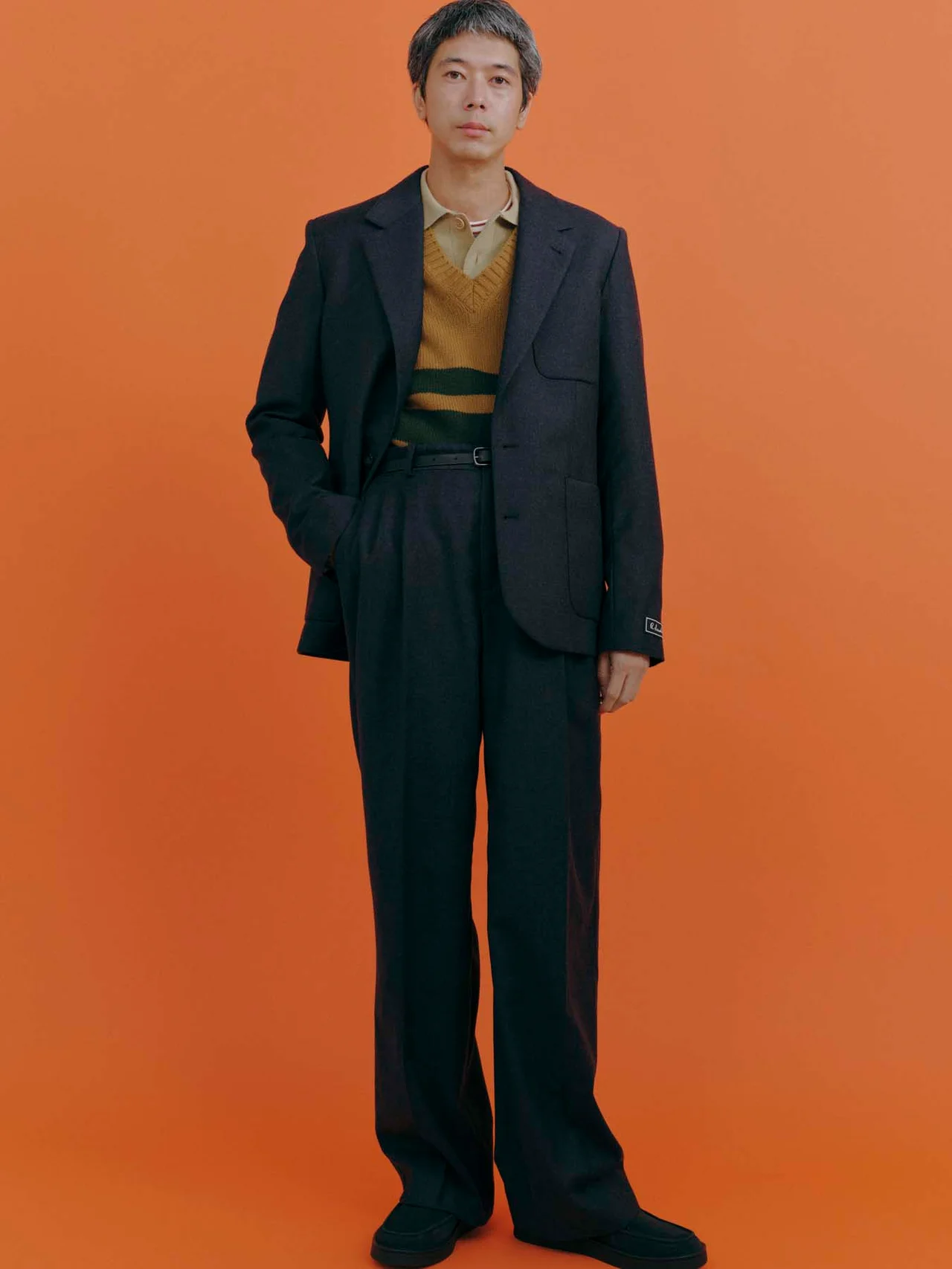 ウールジャケット¥64,900・Vネックニット¥25,300[10月発売予定]・ニットポロ¥25,300・Tシャツ¥12,100・ウールパンツ¥31,900・チャッカブーツ¥20,900[原宿店・EC限定] その他/スタイリスト私物