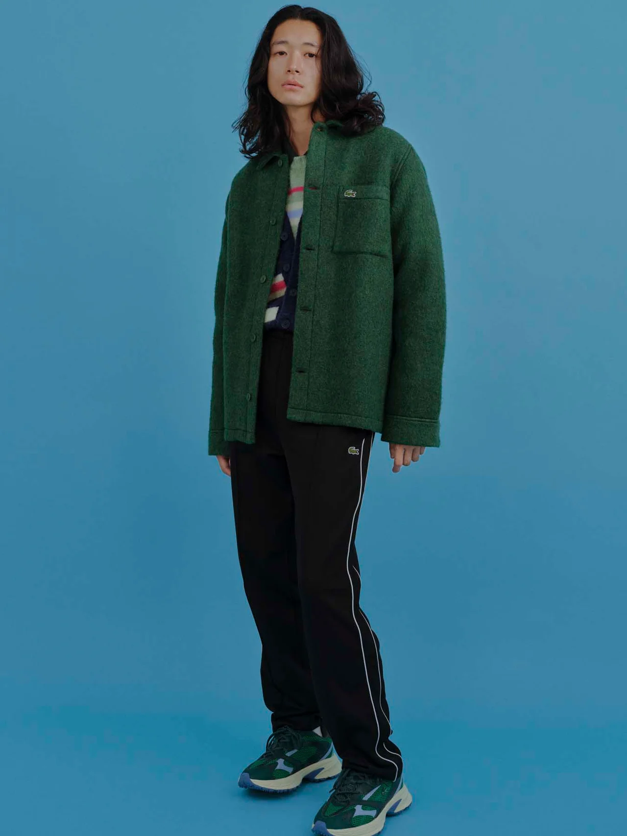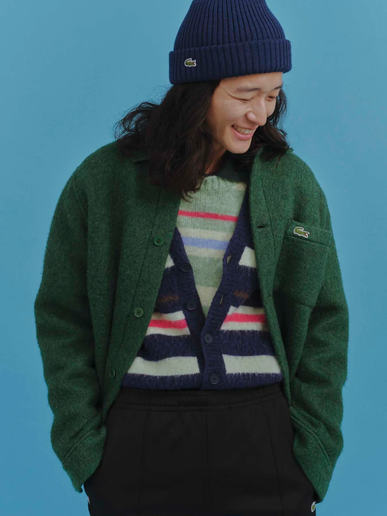 シャギーシャツジャケット¥28,600[10月発売予定]・ニットカーディガン¥27,500[10月発売予定]・ニットプルオーバー¥25,300[10月発売予定]・ポロシャツ¥17,600[11月発売予定]・トラックパンツ¥22,000[11月発売予定]・スニーカー¥18,700・ニットキャップ¥9,130/すべてラコステ(ラコステお客様センター) その他/スタイリスト私物