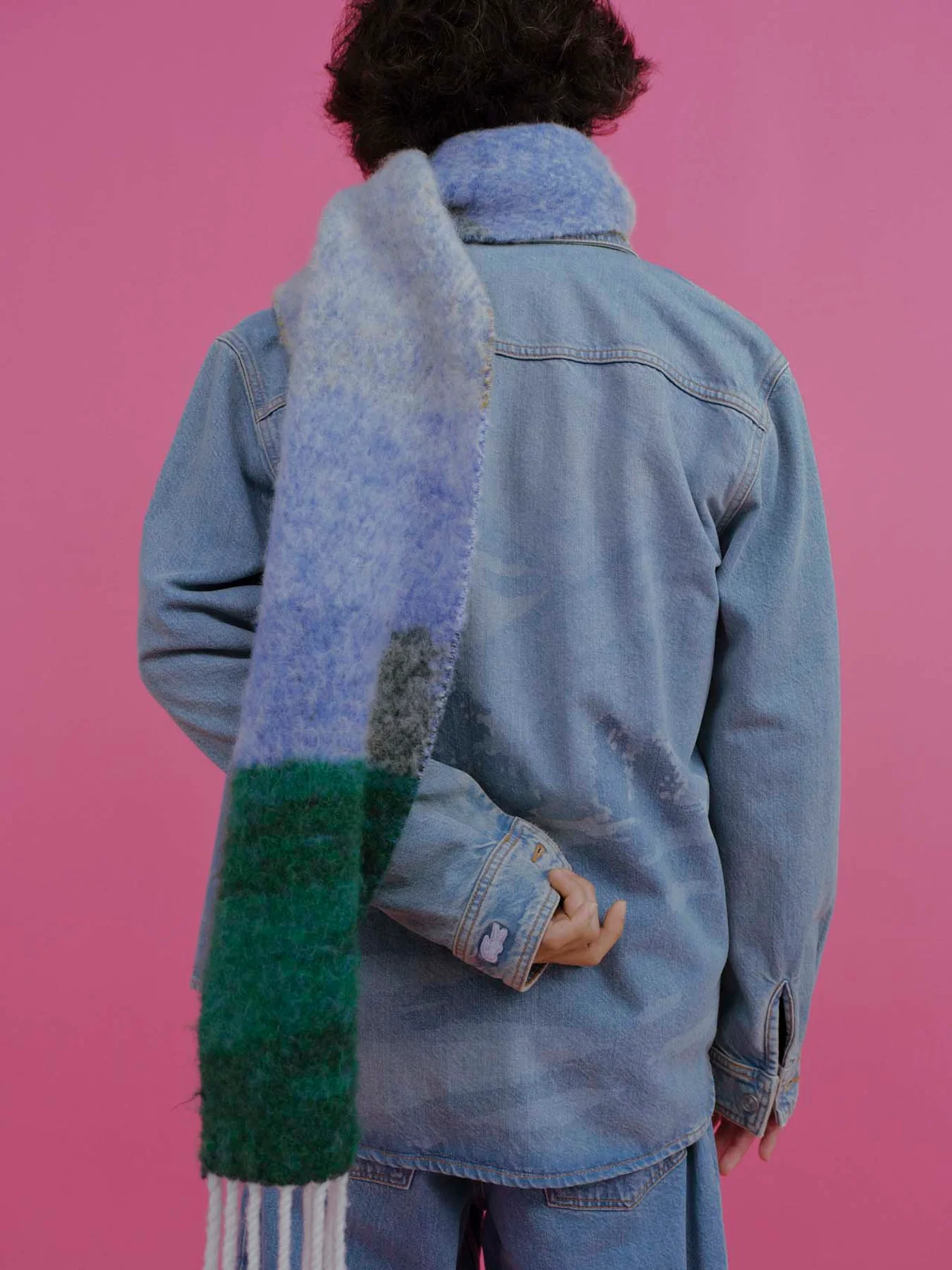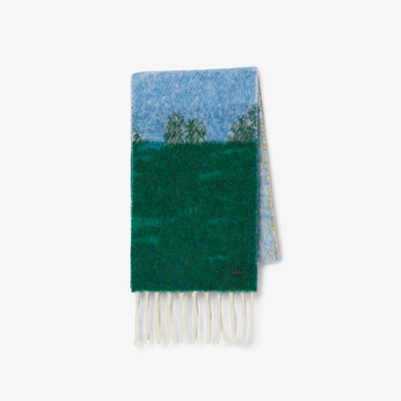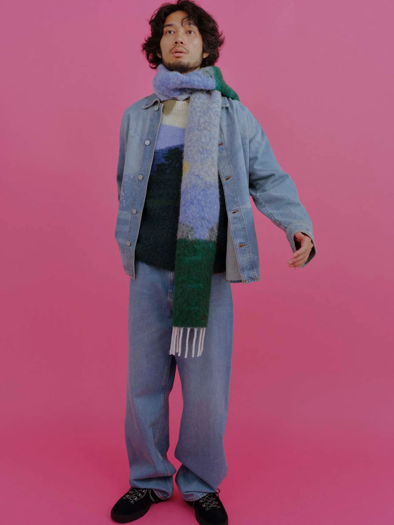 カバーオール同様にピレネー山脈のグラフィックを使用したニットアイテムと組み合わせてスタイリング。ワイドレッグのデニムパンツにニットやロングマフラーでコントラストを効かせつつ、全体は淡いブルーのカラーでまとめる。どれもインパクトのあるアイテムながら、トータルで品よくまとまるのは、ラコステのクリエイティブ・ディレクター、ペラジア・コロトロスのセンスのなせる技。