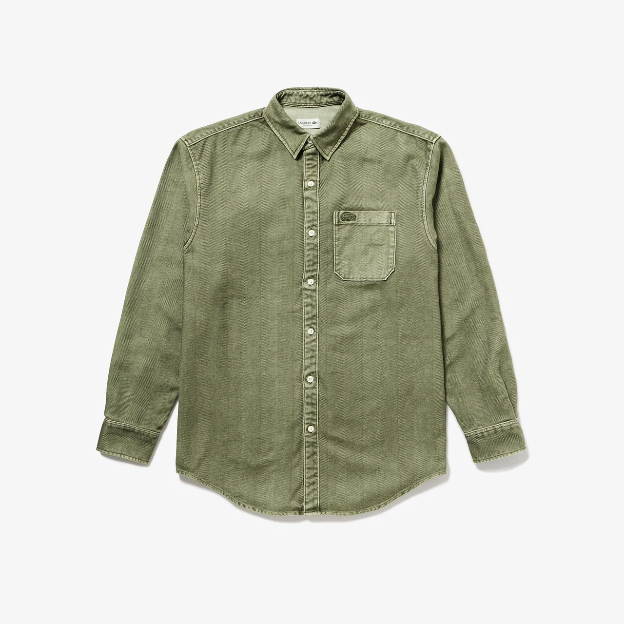 スタイリングはベージュを主体にしたニュートラルトーンにまとめて、淡いグリーンのシャツを差し色に効かせるのがポイント。ボトムスにはワイドテーパードシルエットのデニム。ウエストにドローストリングを内蔵しているのでイージーに着こなせる。足元にはコートシューズをモチーフにしたレザースニーカーを。ワニロゴだけを配したシンプルかつミニマルなデザインは、カジュアルなコーディネートからきれいめなスタイルまで合わせやすく、上品さをキープする。