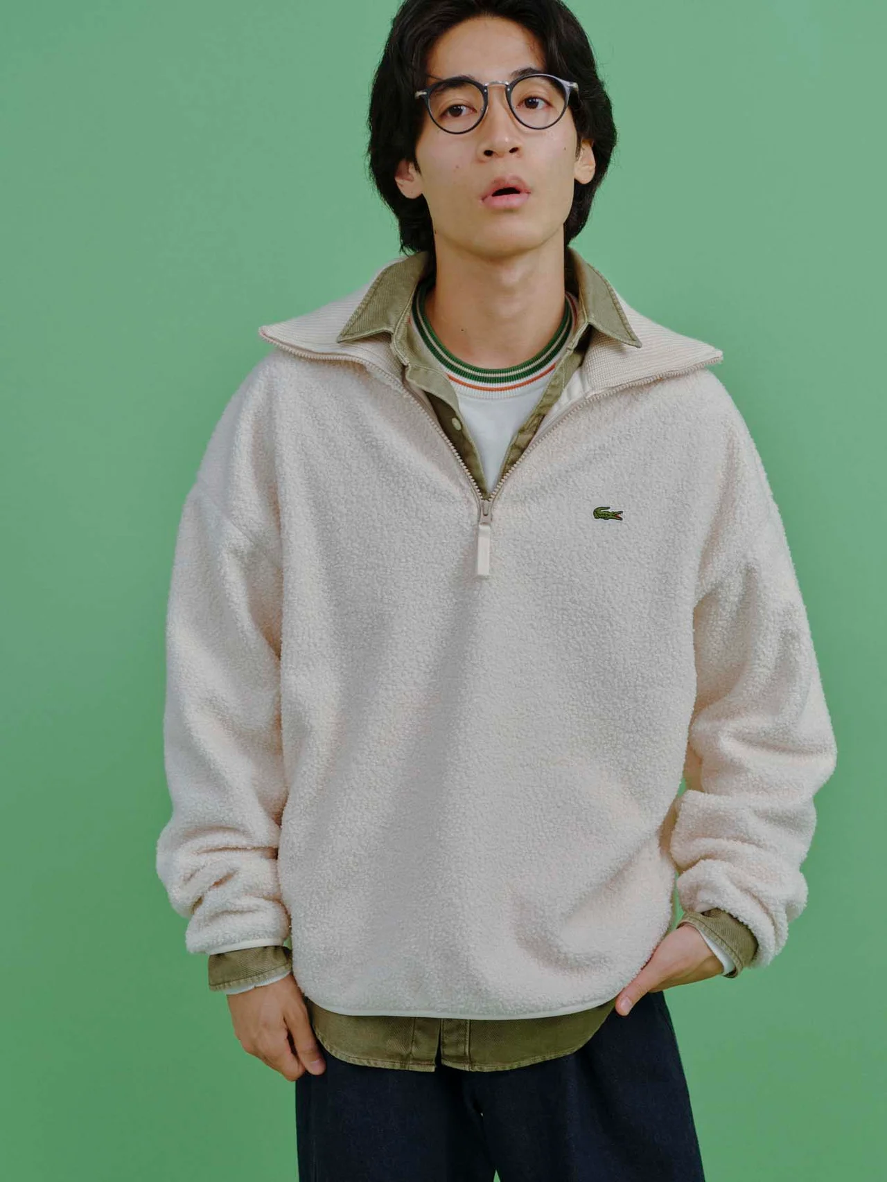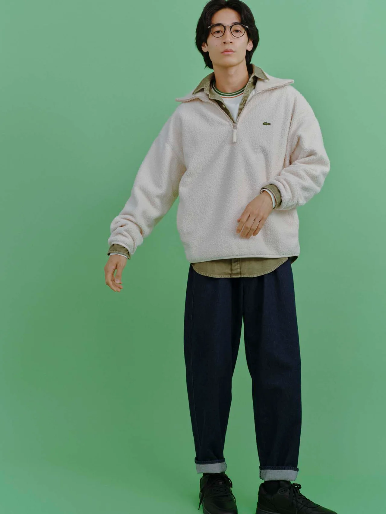 フリースジャケット ¥25,300[10月発売予定]・シャツ ¥20,900・ニットプルオーバー ¥19,800・デニムパンツ ¥18,700・ソックス ¥1,870・コートスニーカー¥19,250/すべてラコステ(ラコステお客様センター) その他/スタイリスト私物