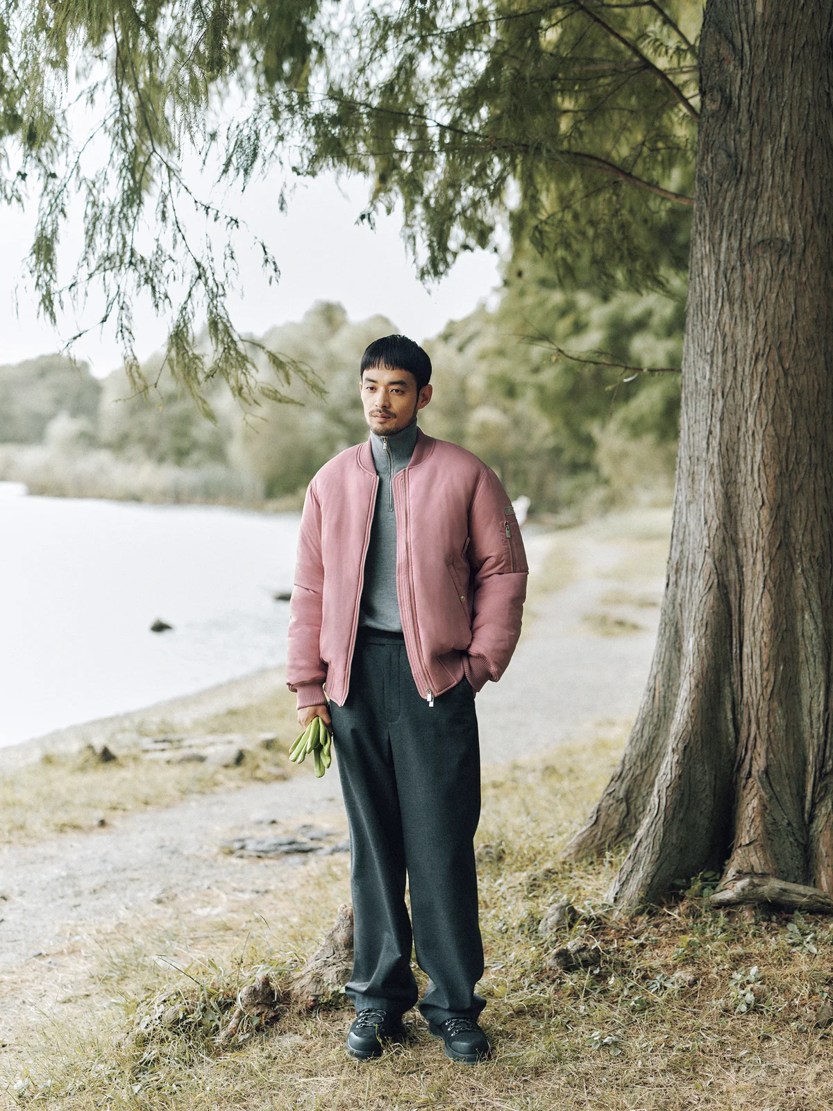 MA-1型でピンクという組み合わせがユニークなモデルの「OSODO」。表地が「40Dセミダルナイロン」の仮撚糸を使ったマットな質感のため、落ち着いた印象に。