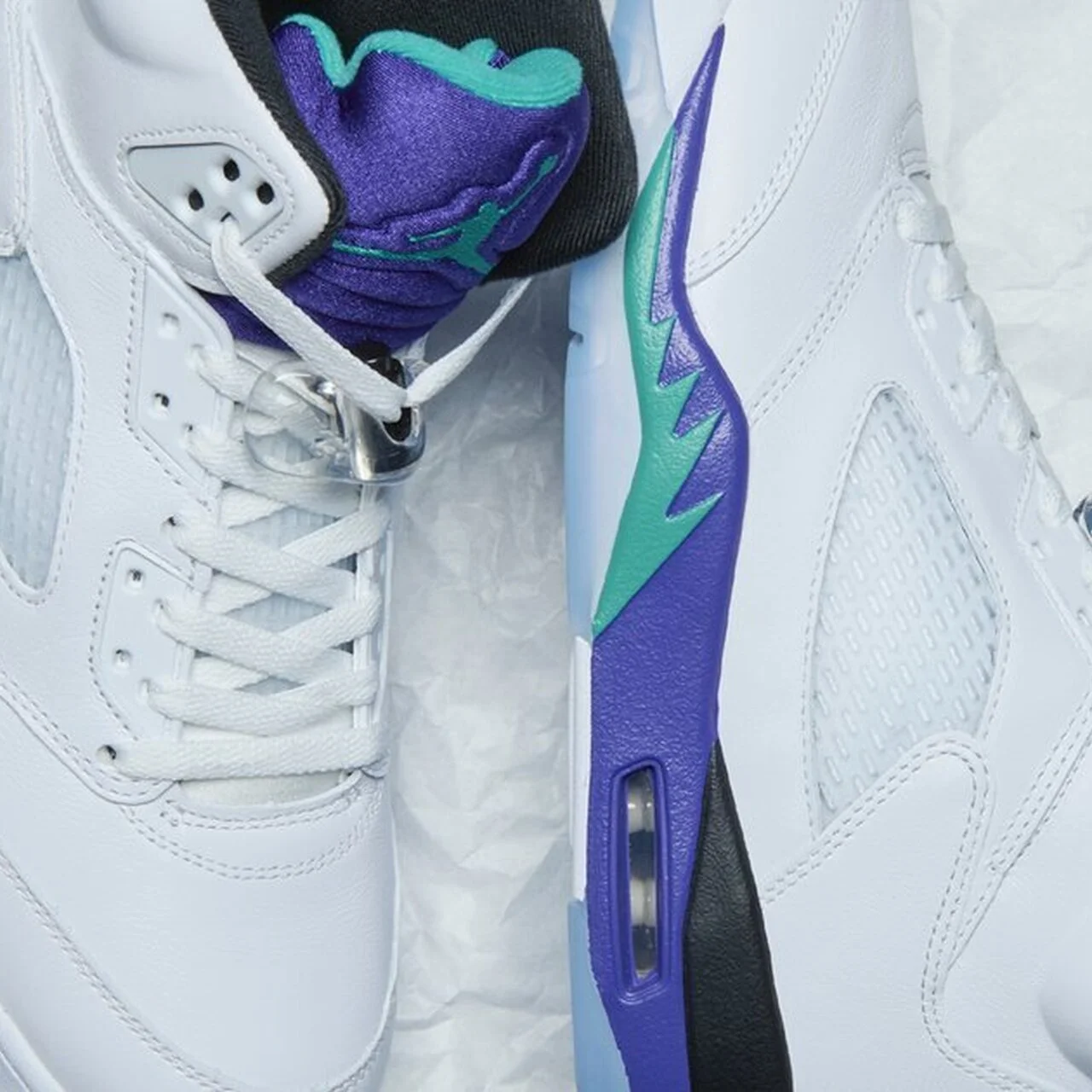 「エア ジョーダン 5は1990年に登場しました。日本でエア ジョーダンの評価を上げたモデルとして、また『スラムダンク』で流川が履いていたバッシュとしても人気です。今回復刻された『グレープ』(パープルとグリーンのコンビ)は、90年代初期にナイキがランニングシューズやほかのバッシュにも採用していたカラーウェイで、個人的にはエア ジョーダン 1のシカゴカラー(ブルズのチームカラーの白・赤・黒の配色)と同じくらいエア ジョーダン 5、イコール『グレープ』というイメージもあります」。