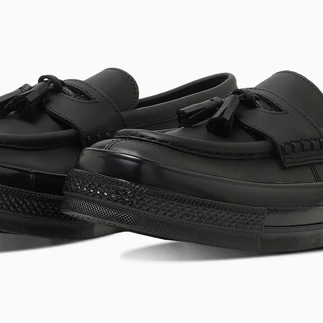 ソールユニットにヴィブラム#186cを採用し、アッパーの素材はシボ革、スエードとメッシュファブリックなどを意識的にミックスした異素材構成。モカ部分のタッセルにはタクティカルコードの意匠を取り入れ、ヒールにはベジタブルタンニンレザーのチックタグとリフレクター素材を配置。変化のある素材使いがブラックワントーンに奥行を生み、唯一無二の存在感を放っている。