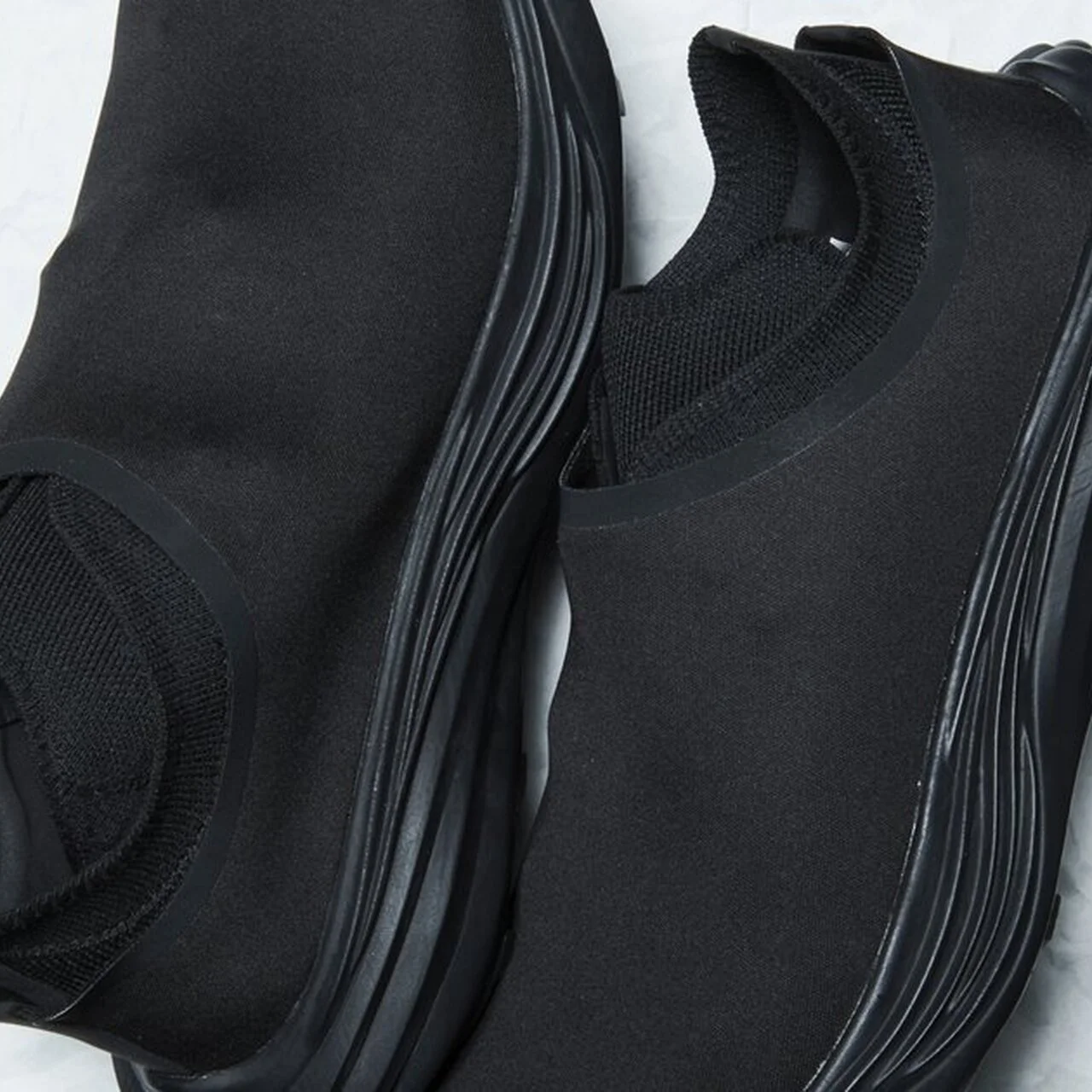 「コペンハーゲン発のモノクロームでソリッドな、それでいてスポーティなニュアンスも携えるモード系のブランド、エリオット・エミルとプーマとのコラボレーションです。ディヴィエイト ニトロ エリート トレイルというプーマのハイテクランニングシューズがベースになっていますが、アッパー全体をテキスタイルでカバーして、ブラックワントーンにしているので、ベースモデルがまったくわからなくなっています。