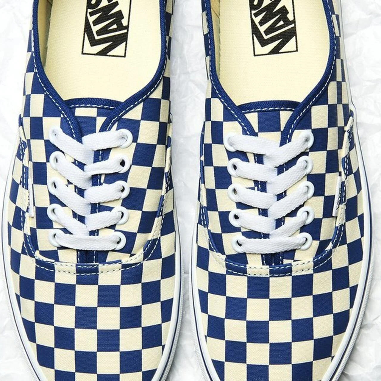 今シーズンはチェッカー柄が新色にラインナップされています。スリッポンやオールドスクールはチェッカーを履いたことがありますが、オーセンティックではまだないので、60周年を機に履いてみたいと思います。普段なら白×黒を選ぶところですが、このブルーのチェッカーが思いのほかよくて。この季節、チノパンに合わせるのもよさそうです」(小澤)