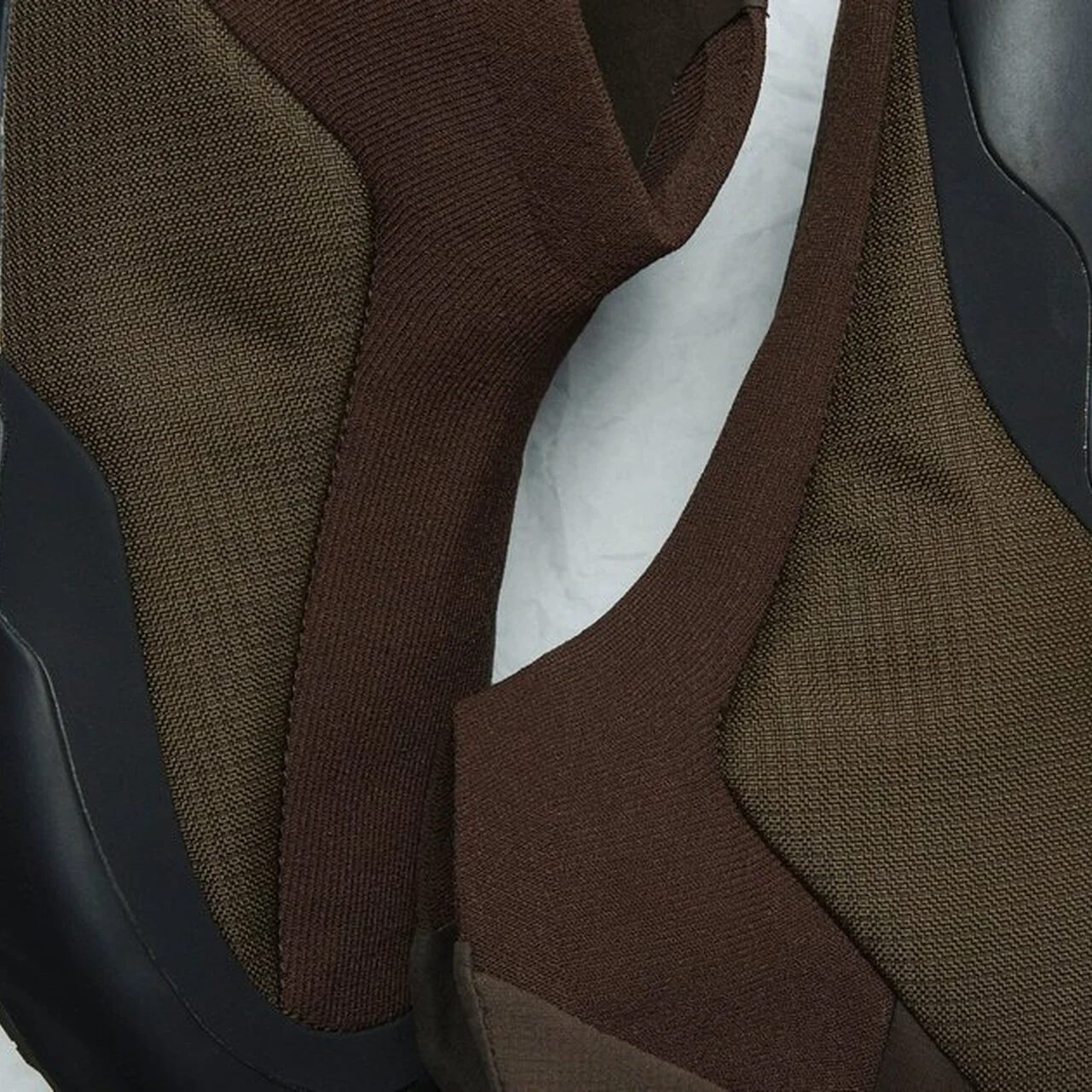 ミッドカットのクラッグ インサレーテッドは、化繊中綿が入ったあたたかいモデルです。ニット部分を広げて、ソックスというか、フィットのいいブーツを履くような感覚で履けます。見た目はシャープでエッジが効いていますが、脱ぎ履きがしやすく、クッション性に優れた厚めのインソール入りで履き心地もいい。ラバー製のトゥキャップとヴィブラムメガグリップソールが一体になったアウトソールで、安定感もあります。