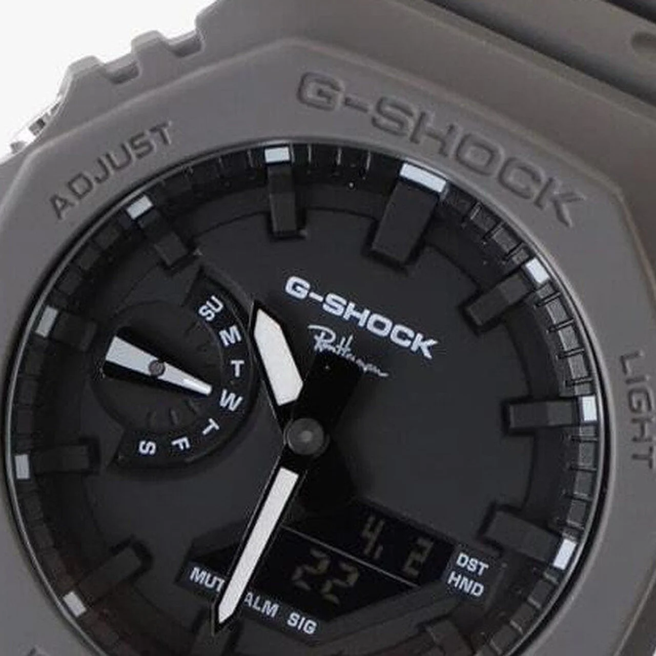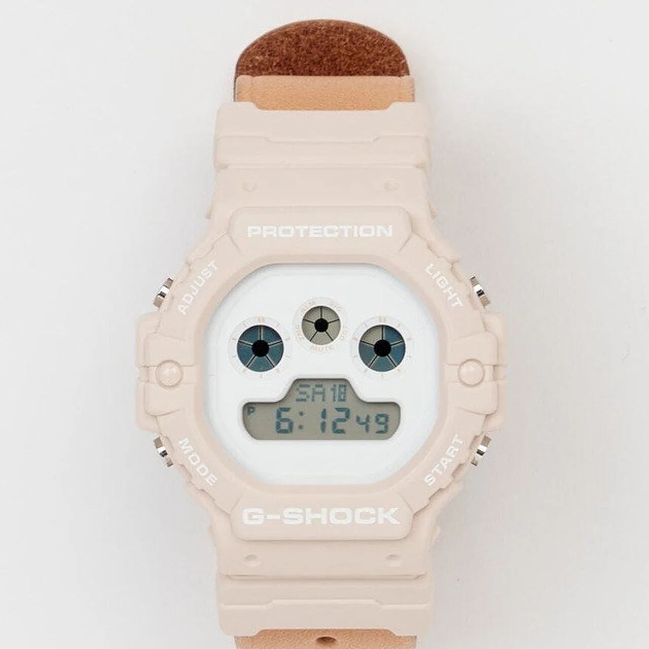 ビューティフルピープルの構造的なものづくりと、Gショックのエンジニアリングが交差し、時計の外観に“未来の痕跡”を刻み込んだ本モデル。レザーの風合いをインクジェットプリントで樹脂バンドに写し取り、メタルパーツにはヘアライン加工を採用。経年を思わせる深い陰影が生まれ、佇まいに奥行きが加わった。触れれば樹脂、見た目はレザー。視覚と触覚の境界を揺らす仕上がりだ。