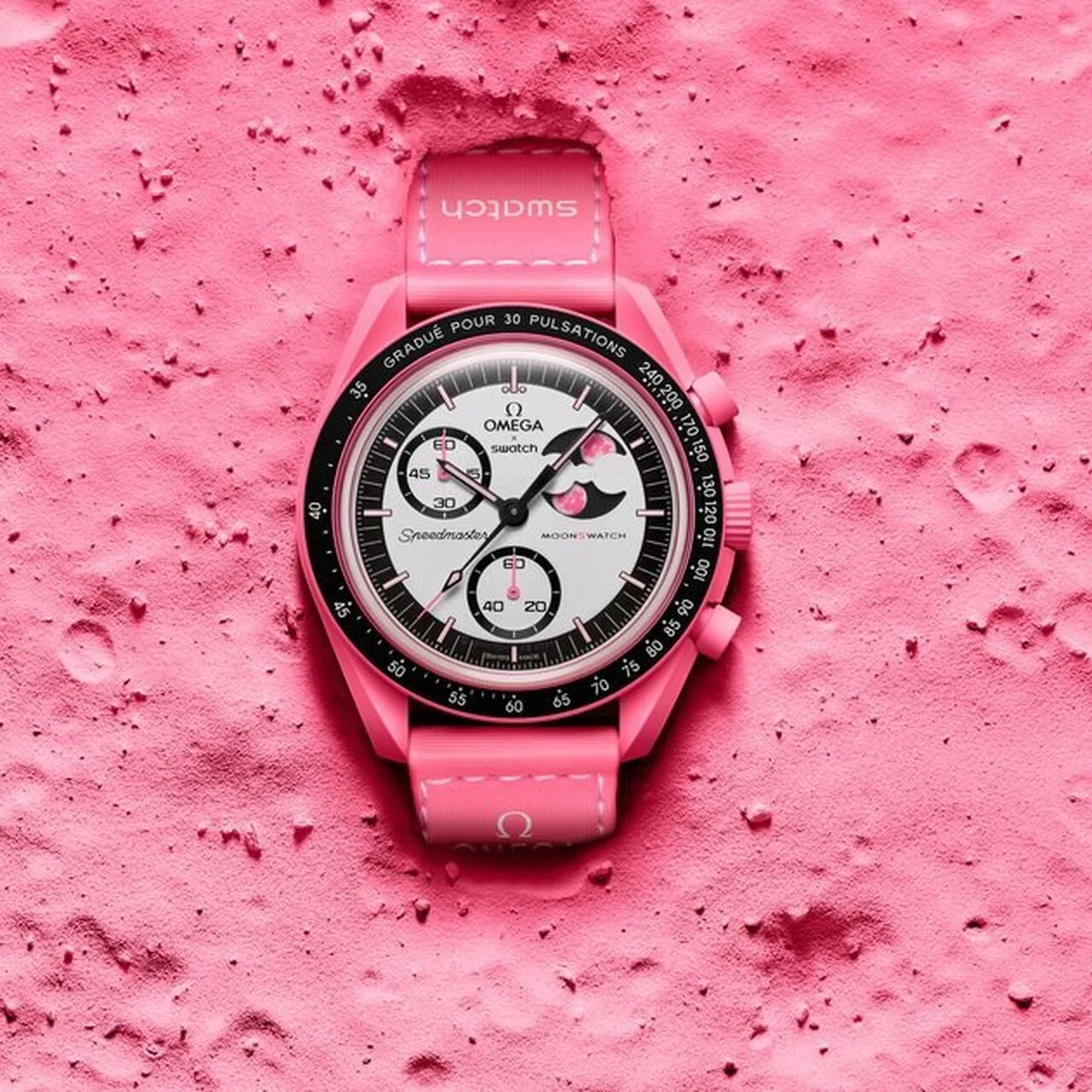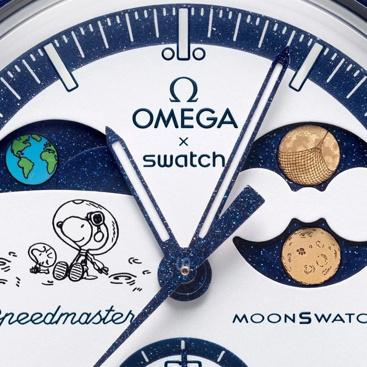 文字盤:ホワイトオパーリン、OMEGA X Swatch と Speedmaster とMoonSwatch のロゴ付き。Grade A Super- LumiNova®(グリーンの発光)を施したサブダイヤルとアワー マーカー。OMEGA のMoonshine ™ Gold でコーティングされ た2つの満月が特徴の、きらめくダークブルーのムーンフェイズ ディスクを備えたムーンフェイズ表示。UVインク(ブルーの発光) の秘密のディテール。星空を背景にした地球と、UVインク(ブルー の発光)でコーティングされた海が特徴のアースフェイズ表示。