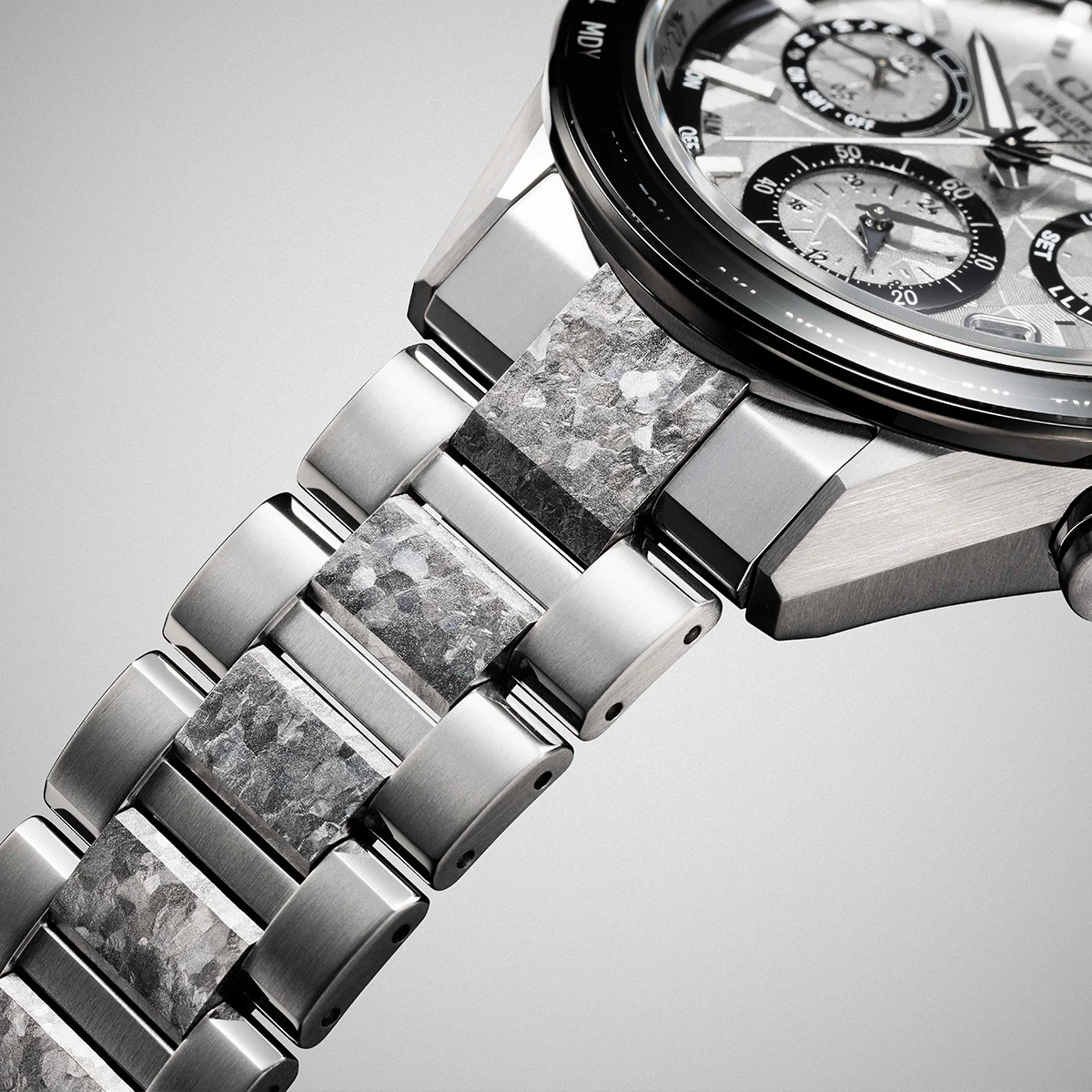 上記の3モデルに共通するのが、中駒に採用されている結晶チタニウム。持ち前のチタニウム加工技術をいかして、チタニウムに特別な熱処理を施して模様として浮かび上がらせたもの。結晶の構造によって模様がランダムになり天然石のようなさまざまな表情を見せる。文字板も結晶チタニウムに合わせたパターンにすることで統一した世界観を構築。