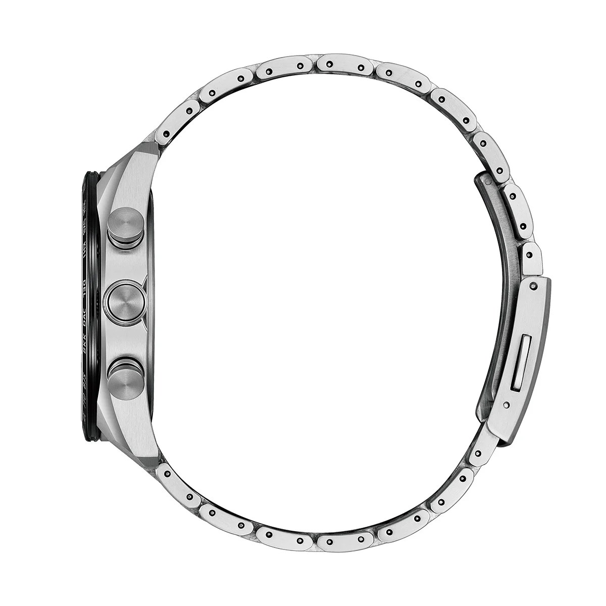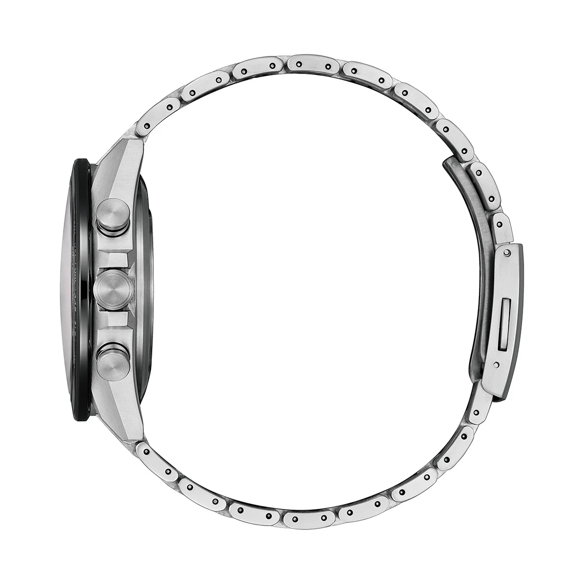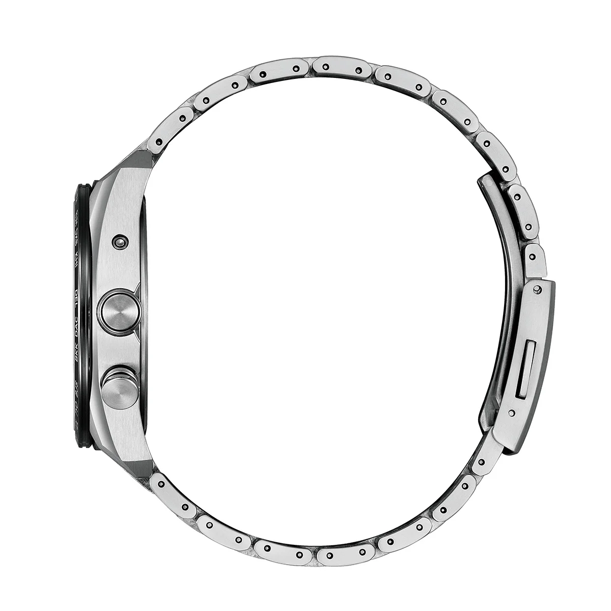 シチズン独自のチタニウム加工技術と表面硬化技術(デュラテクト)を施した素材、スーパーチタニウム™。そのおかげで日常使いによる擦りキズやサビつきから時計本来の美しさを守ってくれる。チタニウムならではの軽さもストロングポイント。ステンレスの約2分の1の軽さゆえ、見た目以上に軽く、腕に心地よくフィットする。