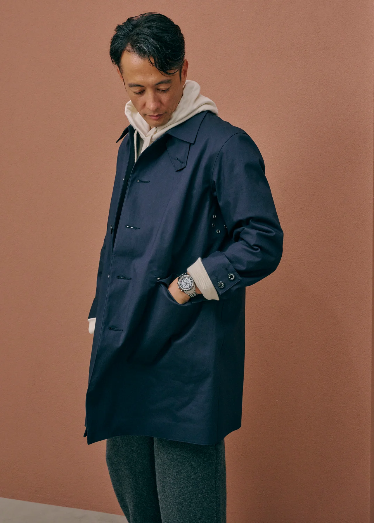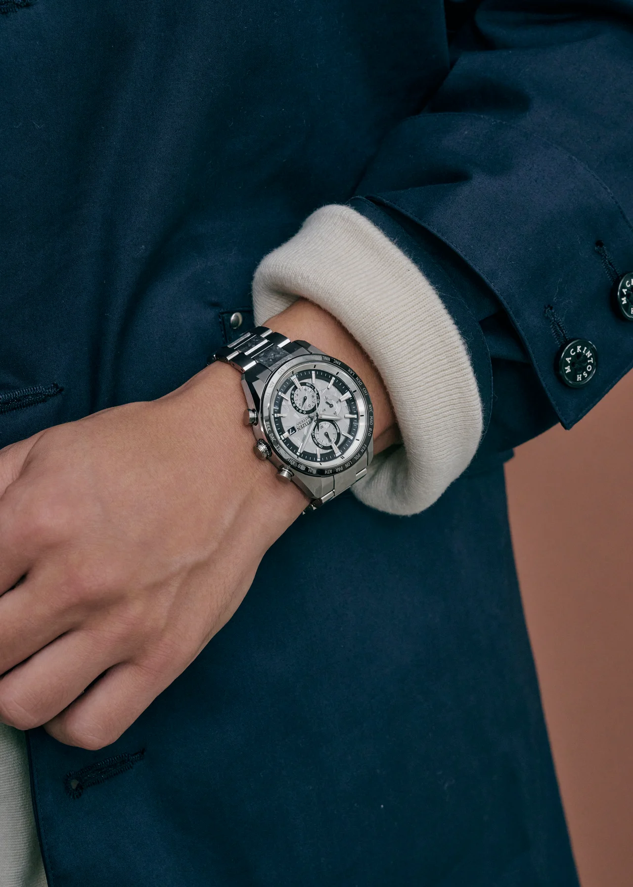 気をつけていても不意にぶつけたり、落としてしまったりで腕時計にキズはつきものだが、その点でもアテッサは頼りになる。シチズンが開発したスーパーチタニウム™製で、キズのつきにくさは想像以上。独自の表面硬化処理を用いたこの素材はステンレスの5倍以上の硬度を誇り、長くその美しい外観を保ってくれる。アテッサと共に着用したのは、ゴム引きコートのエッセンスを引き継いだマッキントッシュのコート。天然ゴムの代わりに透湿防水フィルムを挟みこんだコートで、ゴム引きらしい風合いを備えながらも、雨をはじいて中の湿気も取り除く。両方あれば、キズも雨も憂いなし。