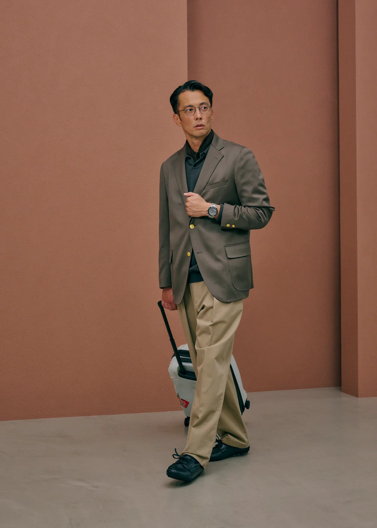 伝統的な“紺ブレ”の形でウールサテンストレッチ素材を使ったJ.プレスのブラウンブレザーも携えれば、機内や移動中のストレスがなく、相手に失礼のないドレスコードも叶う。
