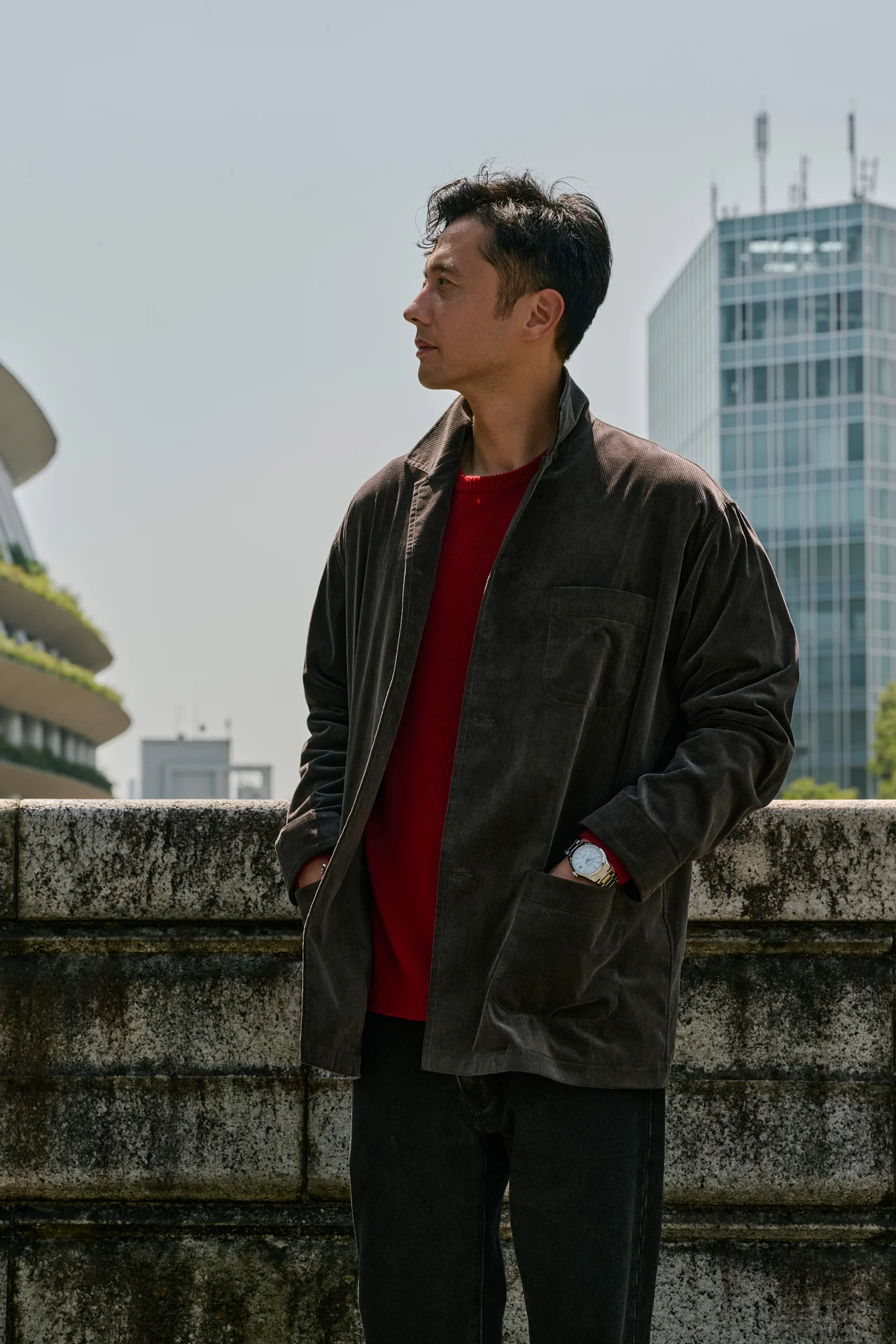 ボリューム感のあるケースは「エボリューション9 スタイル」の特徴で、ブレスレットも太めにデザインされるため、高い装着性とともに腕元でしっかり個性を表現してくれる。これなら、秋を感じさせる細畝のコーデュロイジャケットの存在感にも負けない。赤いニットの華やかさは、シンプルな色使いの時計を引き出す良いアクセントに。フォーマルはもちろん、カジュアルにも合わせやすいことを物語っている。