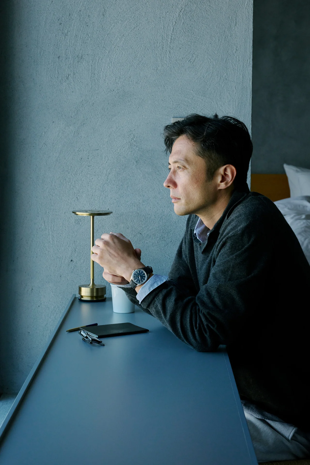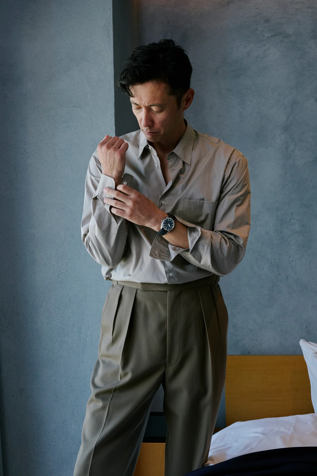 もちろん、シャツにトラウザーズを合わせたドレッシーなスタイルの腕元は「エボリューション9 コレクション SLGW007」の指定席だ。ケース厚が9.95㎜と薄型なので、ドレスシャツの袖口とも干渉せず、着こなしの邪魔にならない。
