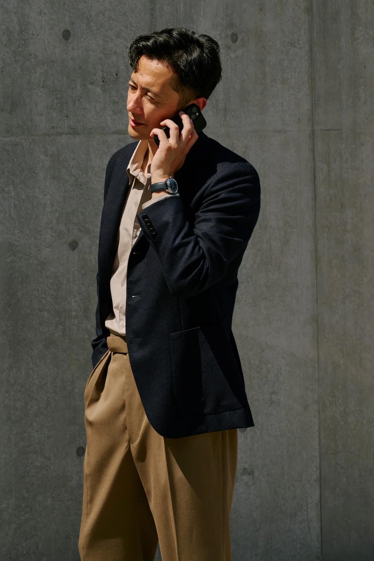 レザーベルトの色と合わせたネイビージャケットを羽織ったスタイリングが、知的なムードを演出する。