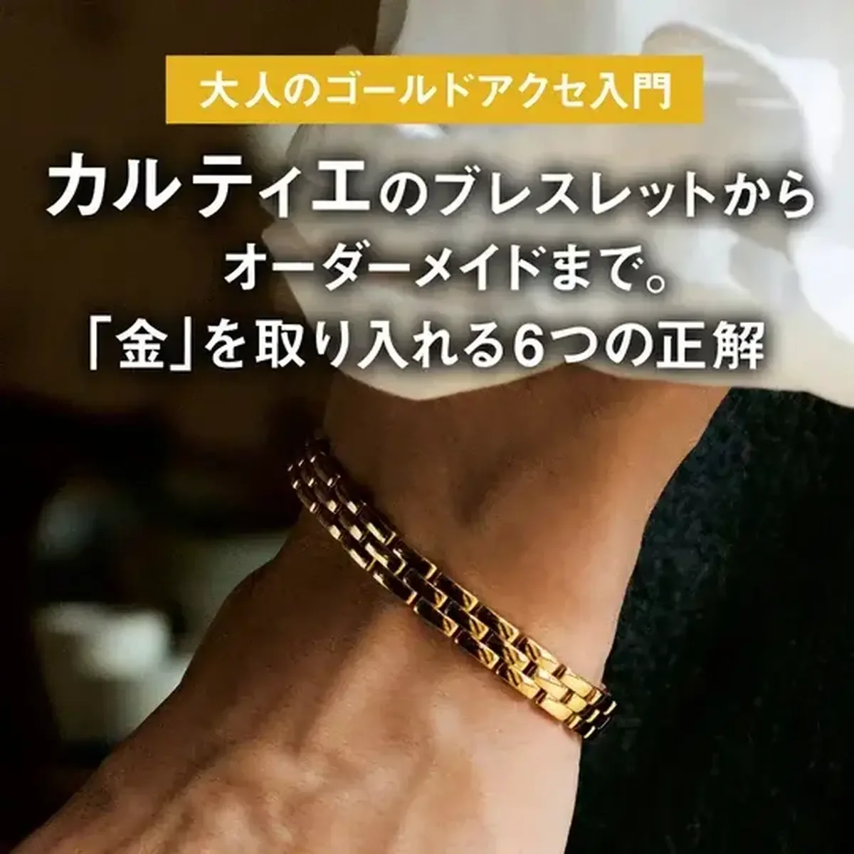トラック型と呼ばれるナローなボディは、リングをはじめ時計などゴールドのアクセサリーとのバランスもとりやすい。全体を鏡面に仕上げているので、どんな仕草をしていてもエレガントな18Kの輝きを享受できる。